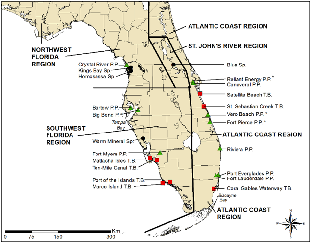 The Florida manatee exhibits high site fidelity, meaning that they return to the same warm water refuges year after year. Manatee management units are broken up by region as indicated in the map below. Generally speaking, manatee regions over-lap some, but rarely do manatees move between coasts. Warm water refugia utilized by manatees are indicated on the map below; green triangle are power plants, black dots are natural springs, and red squares are passive thermal basins. Passive thermal basins are bodies of water where cooling occurs slowly so the body of water retains relative warmth for a period of time.